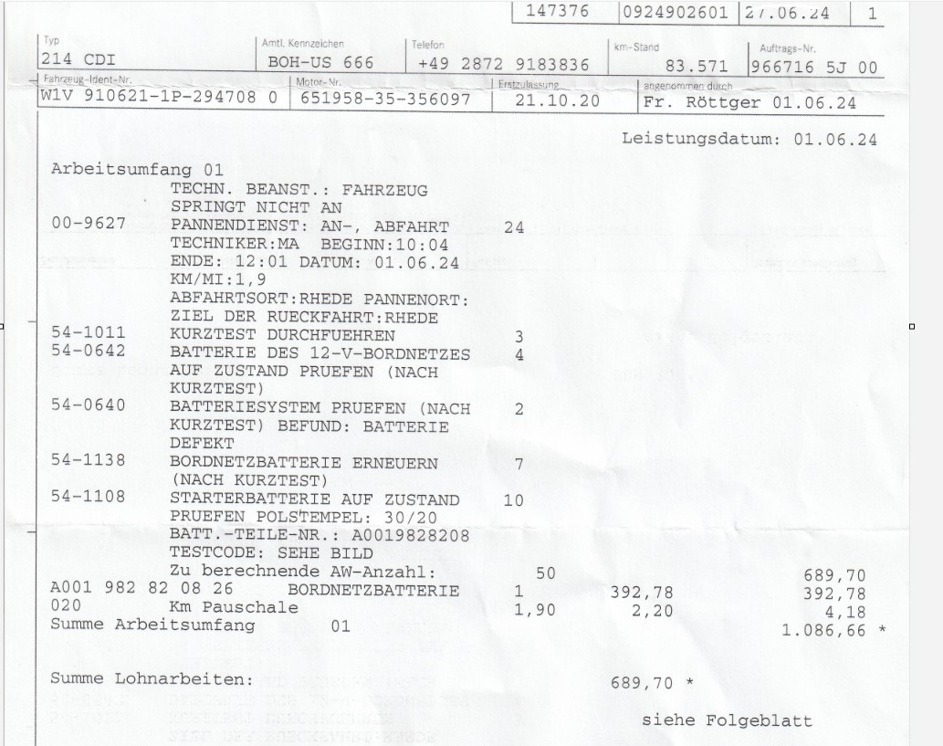 10 Aw = 137,80€ netto um die neue Batterie auf Zustand zu prüfen = Warum? die ist doch neu und original Mercedes.