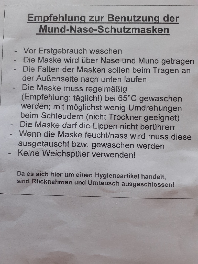Stoffmasken kann man auch im Topf auskochen bzw. auf höchster Stufe bügeln, sagt das Personal aus dem Altenheim.