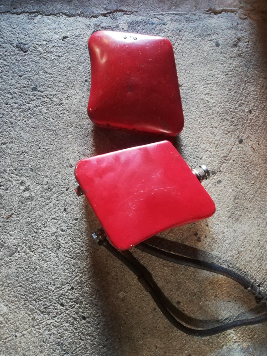 dazu einen in etwa passenden Seitenkasten. Stabiles Blech, rot lackiert. Ohne Schlüssel, dafür umso mehr Löcher.