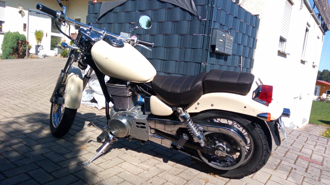 Technisch einwandfrei, breiter Fehling Lenker verbaut und eingetragen, Reifen, Antriebsriemen, Bremsbeläge und -scheibe vorne, Bremsflüssigkeit, Kupplungsbeläge und Ölwechsel mit Filter die letzte Zeit gemacht worden.