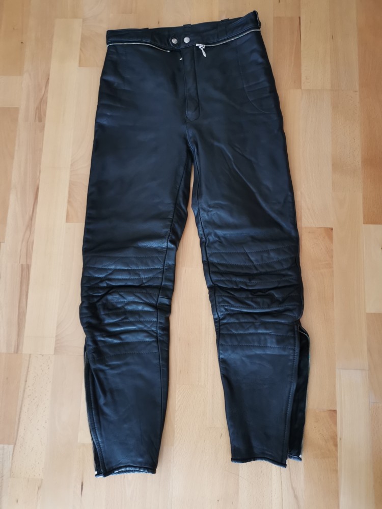 Lederkombi, bestehend aus Jacke, Hose und Nierengurt. Die Jacke lässt sich mittels Reißverschluß an die Hose zippen. Alternativ lässt sich der Nierengurt an der Hose befestigen. Habe mir die Kombi seinerzeit aus einer Kuhhaut anfertigen lassen. Die Sachen sind in einem sehr guten Zustand. Lediglich das Futter der Hose ist etwas angeraut.