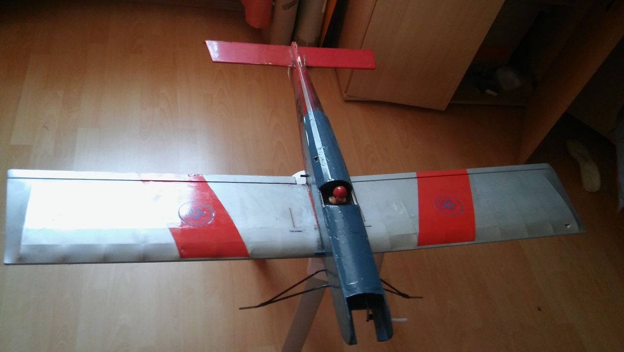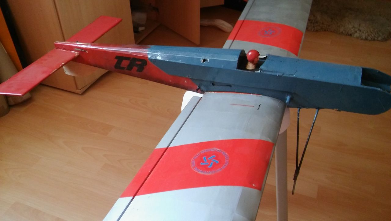 Der Rumpf ist wohl mal in der Mitte zerbrochen, aber wieder geflickt worden. Die Lackierung muss neu und die Leitwerke repariert werden.