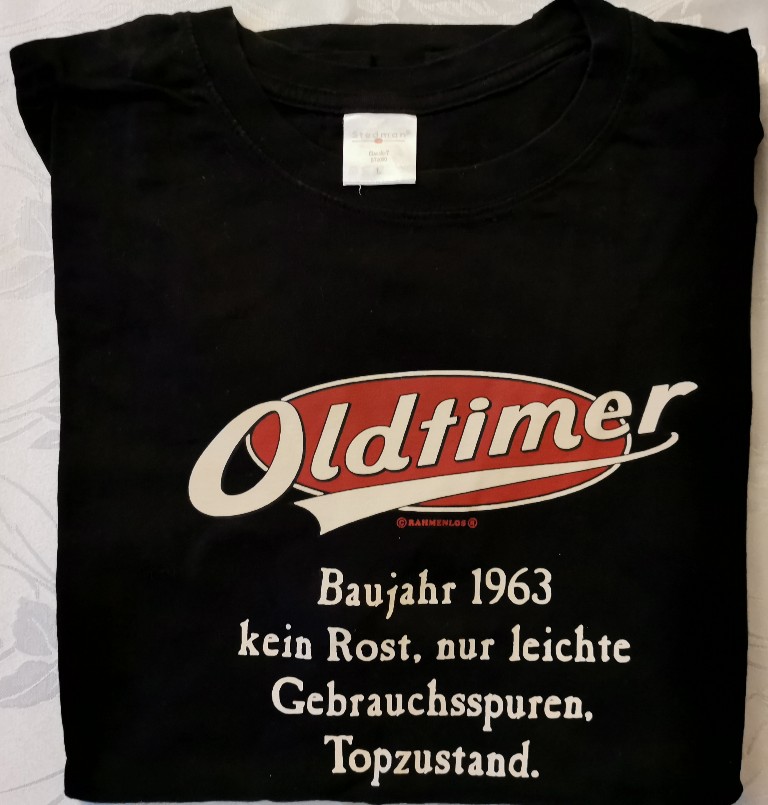 Habe hier ein T-Shirt, einmal gewaschen nie getragen, Größe L abzugeben. Das Baujahr ist eben nicht das Richtige. Falls es bei jemandem passt und er/sie das haben möchte, einfach Hand heben. Passen würde es mir wahrscheinlich auch nicht mehr.