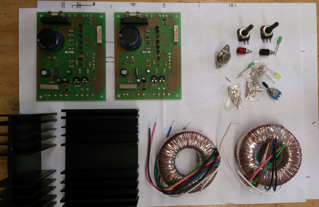 Beide Platinen sind bereits aufgebaut, Ringkerntrafos und ungebohrte Kühlkörper sind dabei. Leider ist nur ein MJ3001 Leistungstransistor da, wie man den ersetzen kann und worauf es dabei ankommt, ist in obigem Link beschrieben, denn den MJ3001 gibts nicht mehr überall im Laden, der 2N3055 geht nicht, mangels ausreichenden Stromverstärkungsfaktors). LEDs und Potis ebenfalls nur ein Satz, und nur ein Bauplan, den ich aber kopieren könnte, wenn jemand nicht beide Bausätze nehmen will.