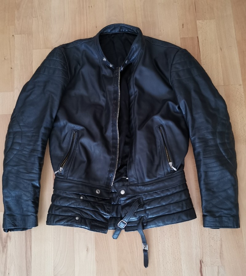 Lederkombi, bestehend aus Jacke, Hose und Nierengurt. Die Jacke lässt sich mittels Reißverschluß an die Hose zippen. Alternativ lässt sich der Nierengurt an der Hose befestigen. Habe mir die Kombi seinerzeit aus einer Kuhhaut anfertigen lassen. Die Sachen sind in einem sehr guten Zustand. Lediglich das Futter der Hose ist etwas angeraut.