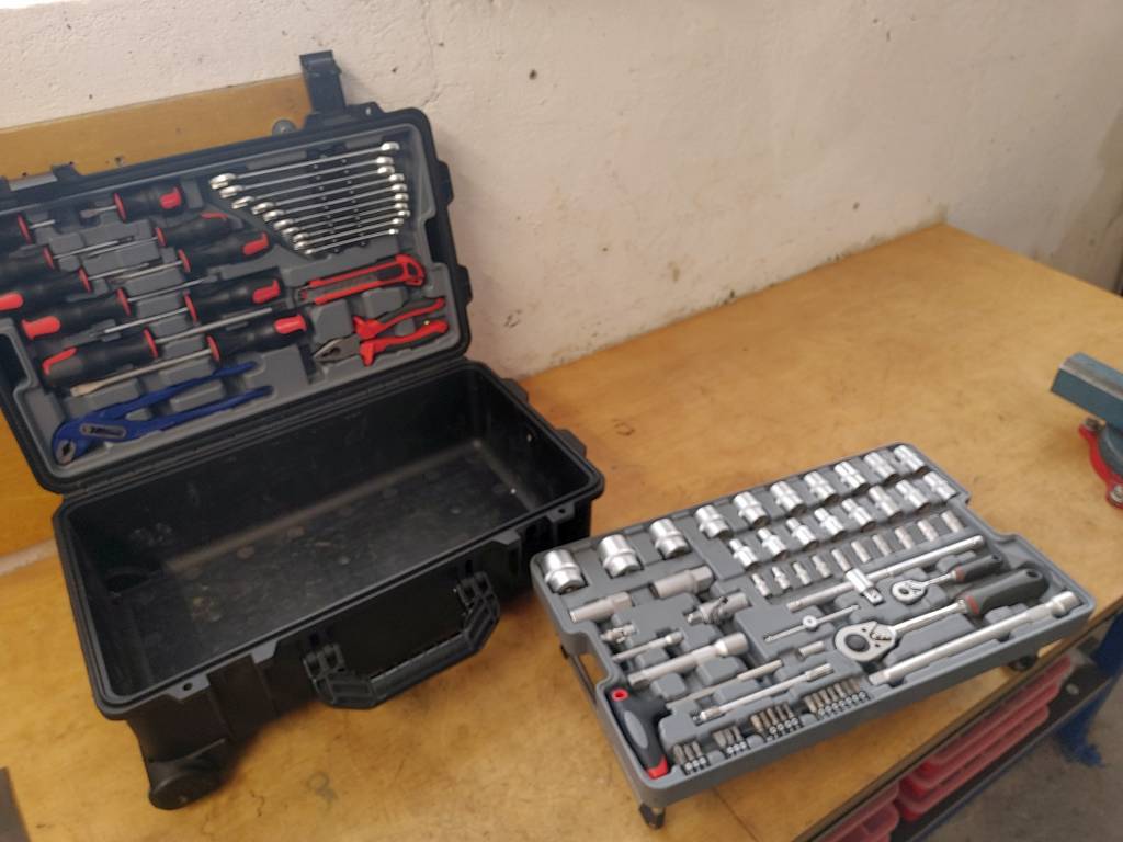 Ein Werkzeugrollkoffer, den ich mal bei meinem Lieblingswerkzeughandel angeboten bekam und ganz dringend mitnehmen mußte. Allerdings habe ich ihn nur selten benutzt. Alle Werkzeuge daher in sehr gutem Zustand oder sogar noch unbenutzt. Die Werkzeugqualität würde ich bei Carolus (Gedore Red) einordnen. Gute Mittelklasse.