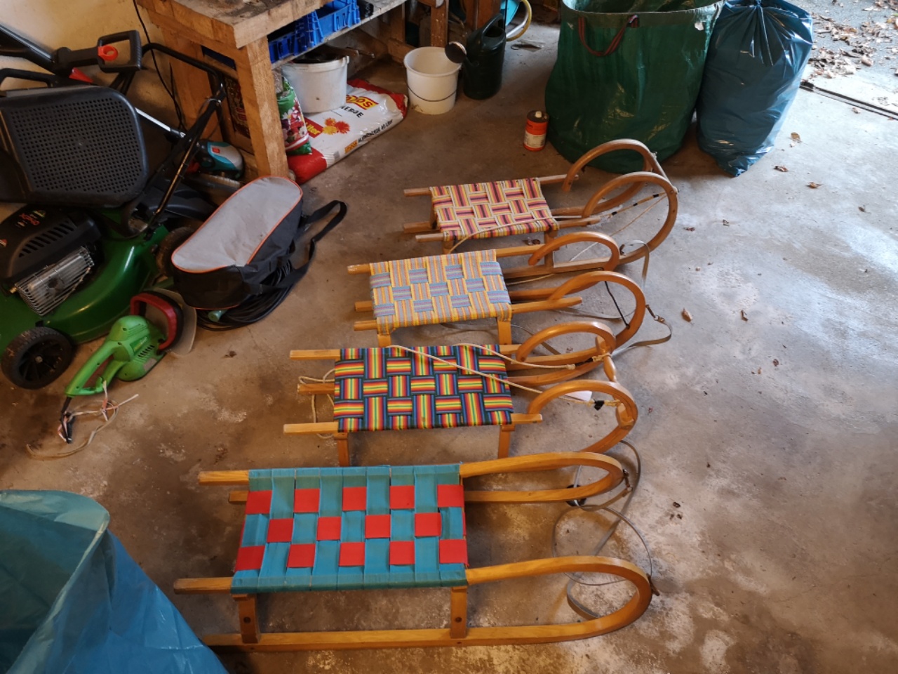 Den vordersten Schlitten mit dem türkis-roten Bezug würde ich sehr gerne besitzen, wenn sich das irgendwie machen lässt