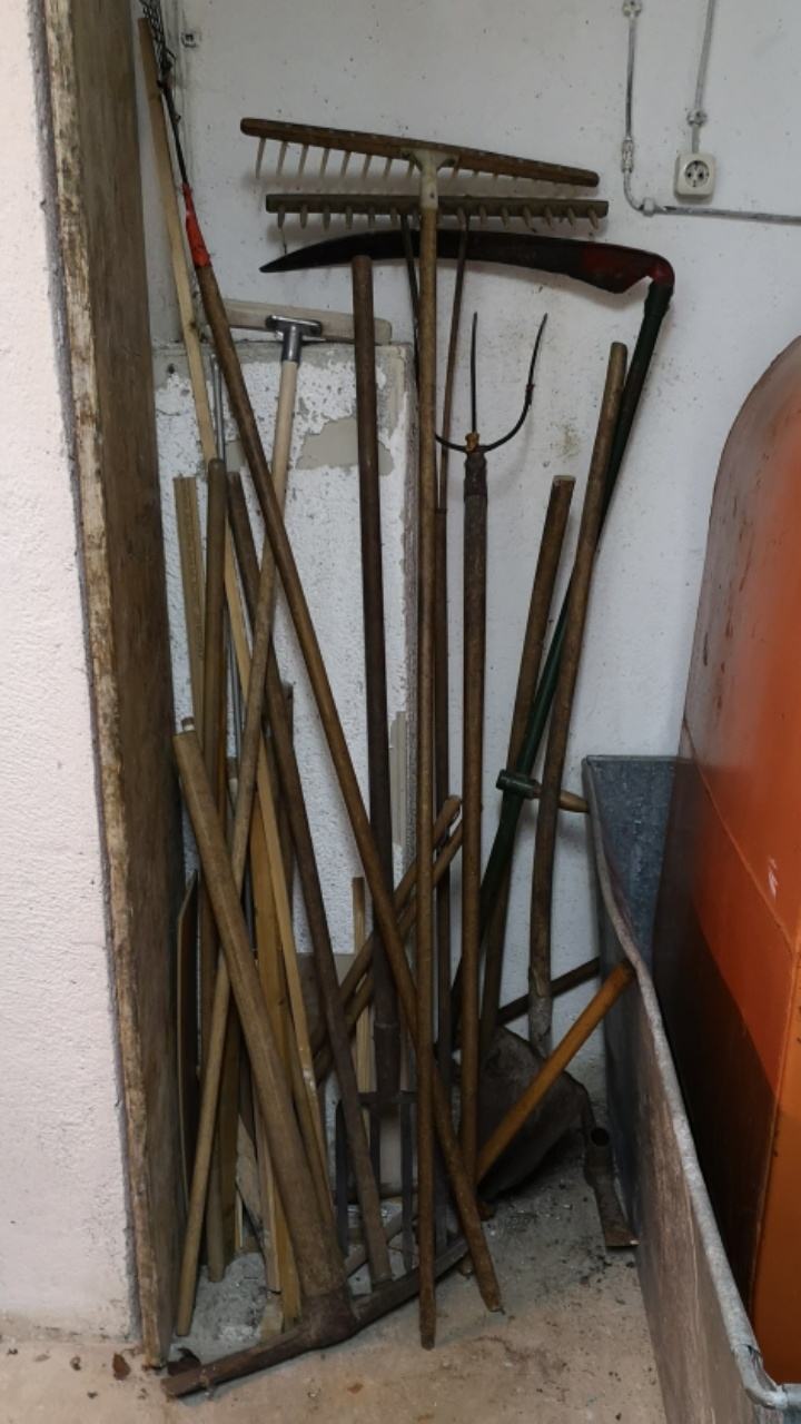Sense mit Stahlwurf, Pickel, Grabgabel, Schaufel, Rechen.