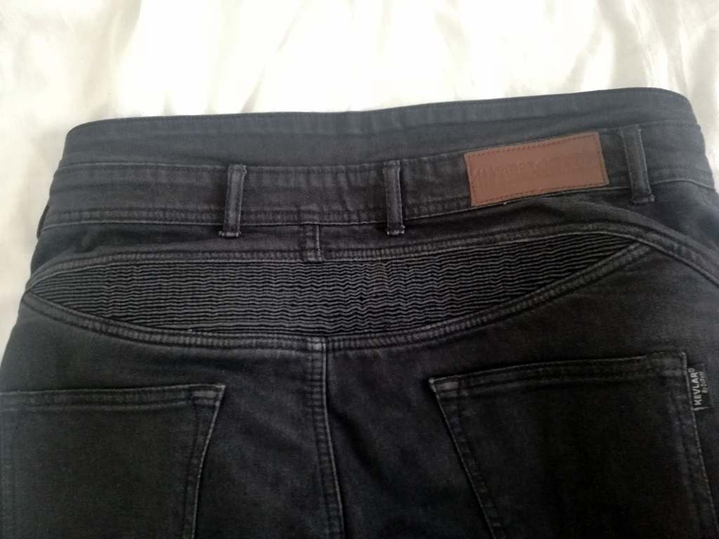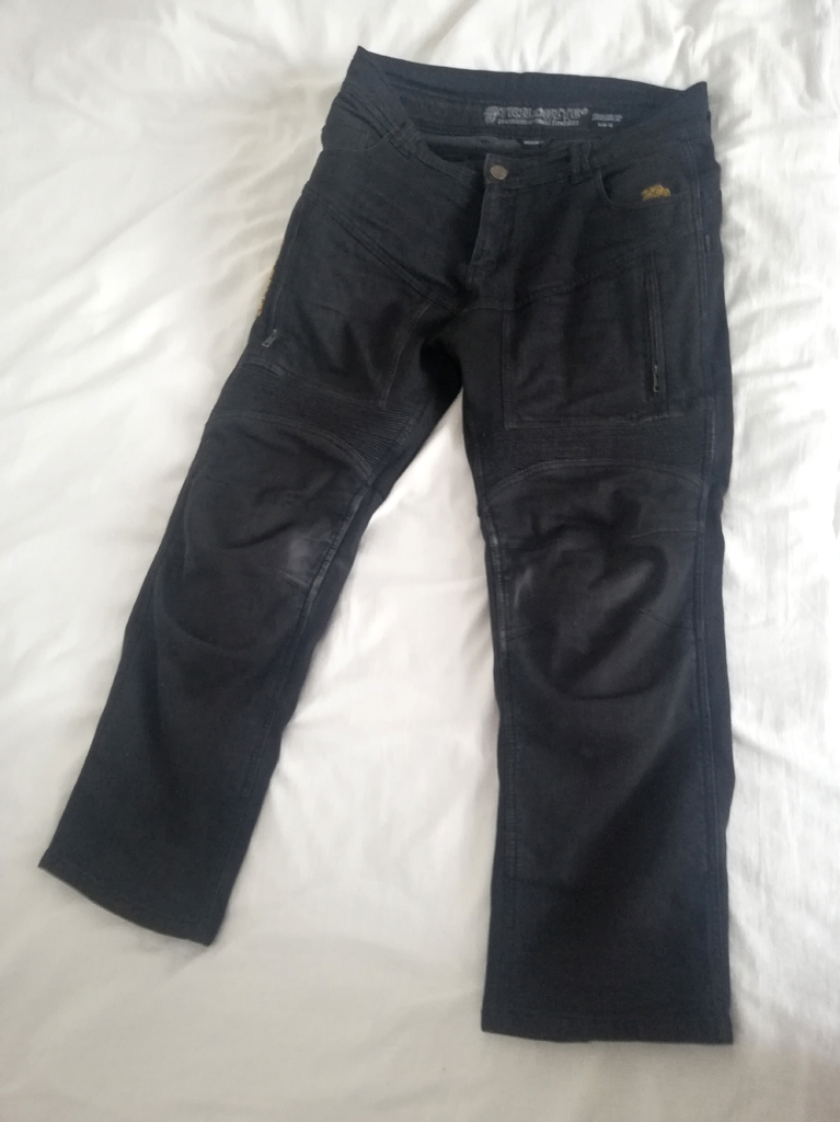 Aramid, vier Protektoren, überall Reißverschlüsse und Schlaufen und Stretch, Weltraumtechnik - das Ding fliegt eigenständig zum Mond und zurück, aber nützt ja nix wenn man zu fett geworden ist und nicht mehr reinpasst.