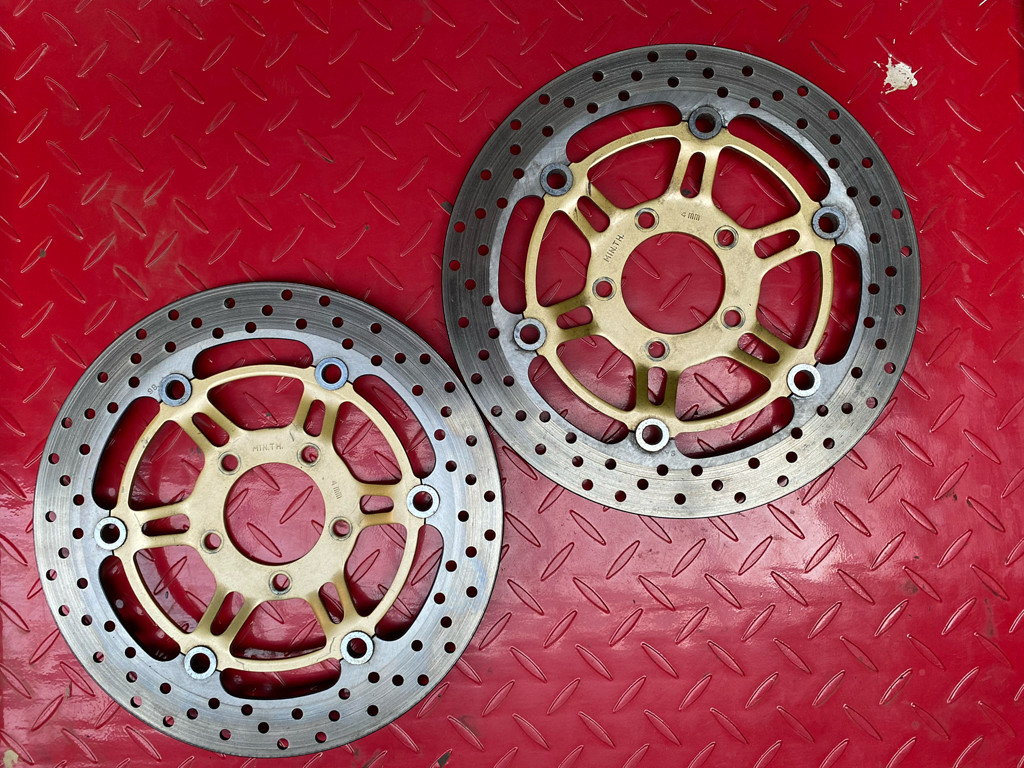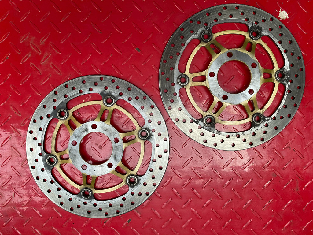 Zwei Bremsscheiben einer Suzuki SV 650, beide Scheiben haben noch etwas über 4,4mm Dicke. Zustand gut.