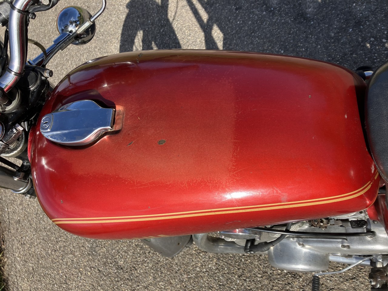 Optischer Zustand original überarbeitet mit altersgemäßen Spuren, Lacksatz beulenfrei mit Schäden / Verfärbungen siehe Fotos, Chrom teilweise picklig, Motorgehäuse teilweise fleckig, Sitzbank siehe letztes Bild, original, Schale oberflächenkorrodiert, strukturell gut, Schaum durchgesessen, Bezug 2 hinterklebte Risse