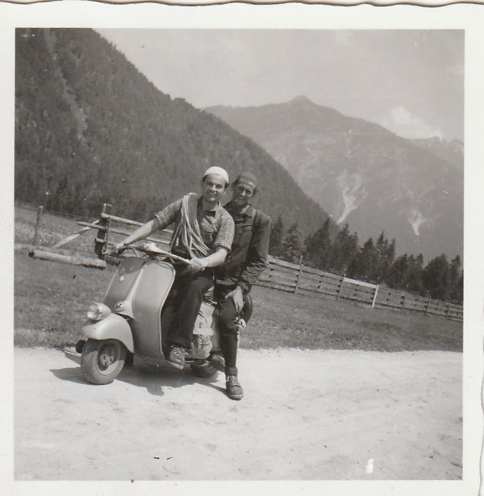 Sie zeigen meinen Vater auf seinem ersten motorisierten Untersatz, eienr Vesap 98. Das ist die erste, die Piaggio gebaut hat, noch mit dem geraden Beinschild. Das eine zeigt ihn mit einem Kletterspezi auf dem Weg zumKlettern irgendwo in den bayrischen Alpen.