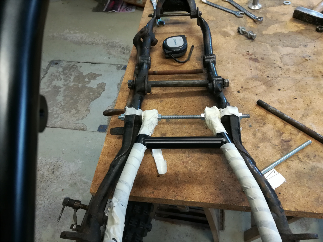 Jetzt kanns nun eindeutig starr weitergehen. Adapter müssen angefertig werden, die Löcher am Rahmen müssen gerichtet werden und das Hinterrad an seinem neuen Platz muss zentriert werden.