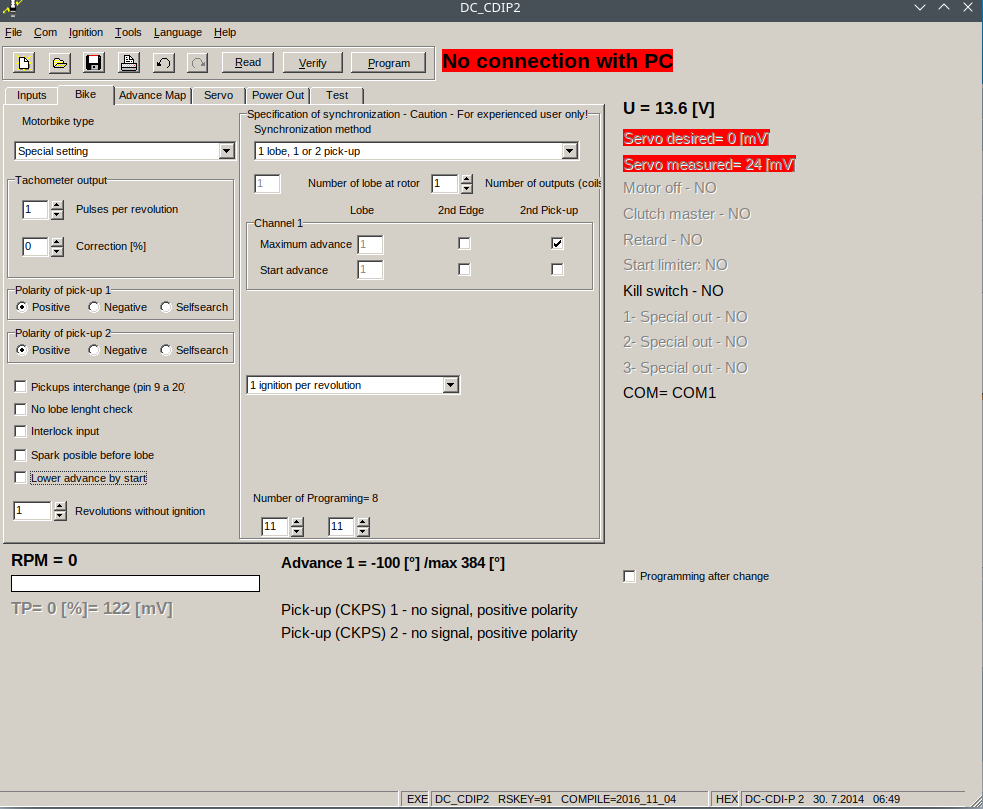 Klemme ich den 2. Sensor ab (Frühzündung), startet die Maschine zwar, läuft aber, auch im Leerlauf, extrem unrund, so als ob nur alle paar Umdrehungen gezündet wird. Die Zündung erwartet also den 2. Sensor und kann ohne ihn garnicht arbeiten. Das unterscheidet sich grundlegend zur v105, bei der das Starten ohne den 2. Sensor problemlos funktioniert.