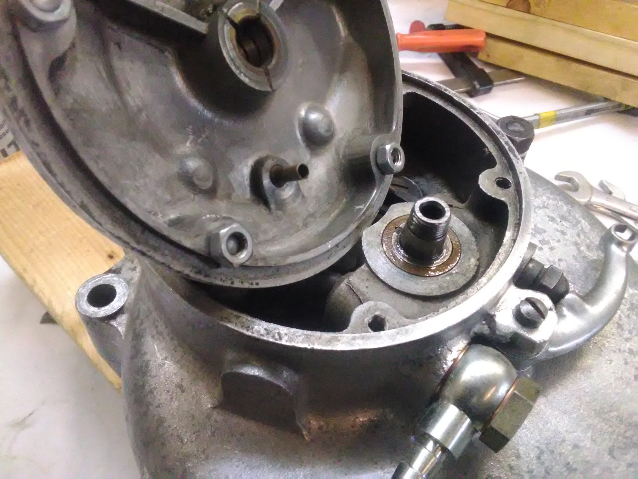 Jetzt kommt meine wichtige Frage: Ich habe ein Bild eingefügt. Auf dem sieht man die Steuerseite des Motors. Da ist der Stumpf der Kurbelwelle mit Loch zu sehen. Da muss das Öl nun hinein. Daneben liegt der Deckel. Dort sieht man ein Röhrchen. Das ragt ca. 10mm in die Bohrung der Welle hinein. Nun ist aber das Röhrchen 5mm und das Loch in der Welle 6mm. Dazu kommt, das zwischen Deckel (wo das Röhrchen raus kommt) und Welle 2,8mm Abstand ist. Das heißt, dass da ein "riesiger" Spalt ist!! Erstmal einen halben Millimeter Spiel zwischen Röhrchen und Bohrung in der Welle und dann noch ein Abstand zwischen Deckel und Welle von 2,8mm. Da flutscht doch alles Öl dran vorbei. Oder wird das Öl vom Unterdruck des Gehäuses angesaugt und dann zentrifugal durch die Kurbelwangen zum Kurbelzapfen geschleudert?? Also ich bin da unsicher. Am liebsten hätte ich eine flexible Dichtung von 3mm die den Spalt zwischen Deckel (wo das Röhrchen austritt) und Wellenende zumacht. Dann würde der Öldruck direkt in die Kurbelwelle gehen und nicht teilweise dran vorbei flutschen.