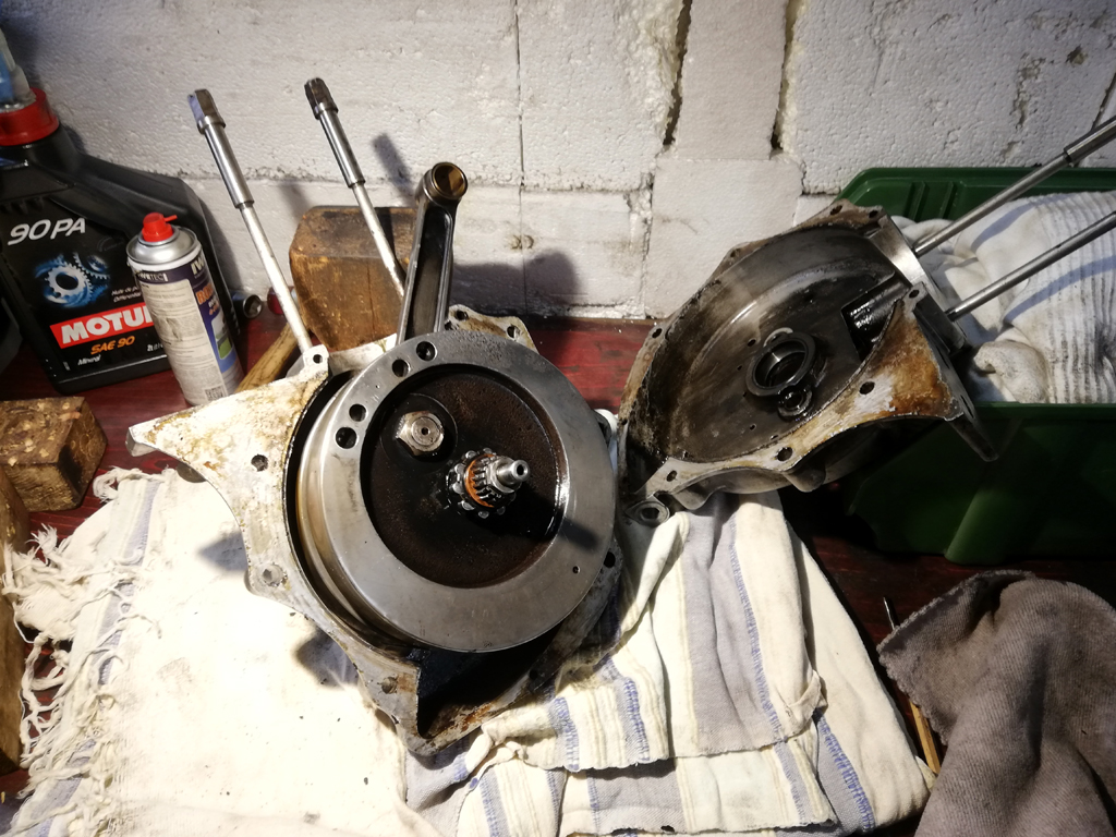 Heute so getan, wie Vic (für Außenstehende: Ein Freund von Mike mit Wissen und Möglichkeiten) mir vor ein paar Tagen geschrieben hat. Schauen, ob das Pleuel nicht doch schief ist mittels Parallelunterlagen und begucken/messen in unterschiedlichen Positionen. Kamen lustige Ergebnisse bei heraus, und dann hab ich mir die Passung Pleuelauge/Kolbenbolzen nochmal genauer angesehen. Keine Ahnung, warum mir das früher nicht aufgefallen ist und ich das Gegenteil behauptet habe - vielleicht Schönreden, vielleicht falsch angefasst die Sache. Egal. Fakt ist, dass der Kolbenbolzen deutlich Höhenspiel im Pleuelauge hat. Klack-klack-klack. Kann man beim besten Willen nicht so lassen. Außerdem meinte ich nun auch, Höhenspiel im unteren Pleuelauge zu spüren.