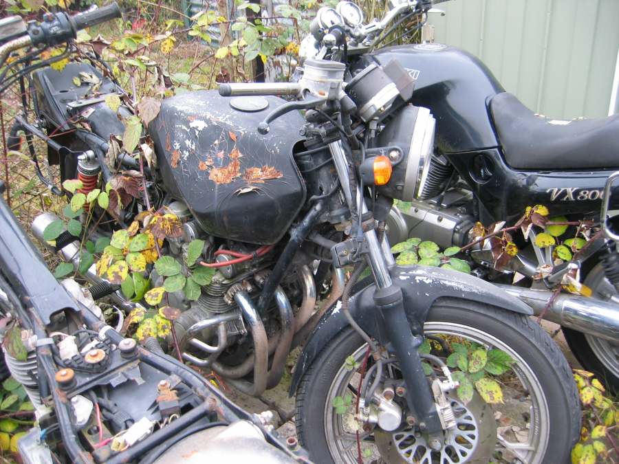 3) VX 800: 87.000km+, 300,-Euro. Motorschaden! Ein Stück vom Motorblock ist vorne rausgebrochen! Wahrscheinlich wollte das Pleuel Sonnenlicht sehen. Wiundert mich bei der VX...Es soll aber keinen Schlag gegeben haben, sie ging einfach aus. Mit Papieren.