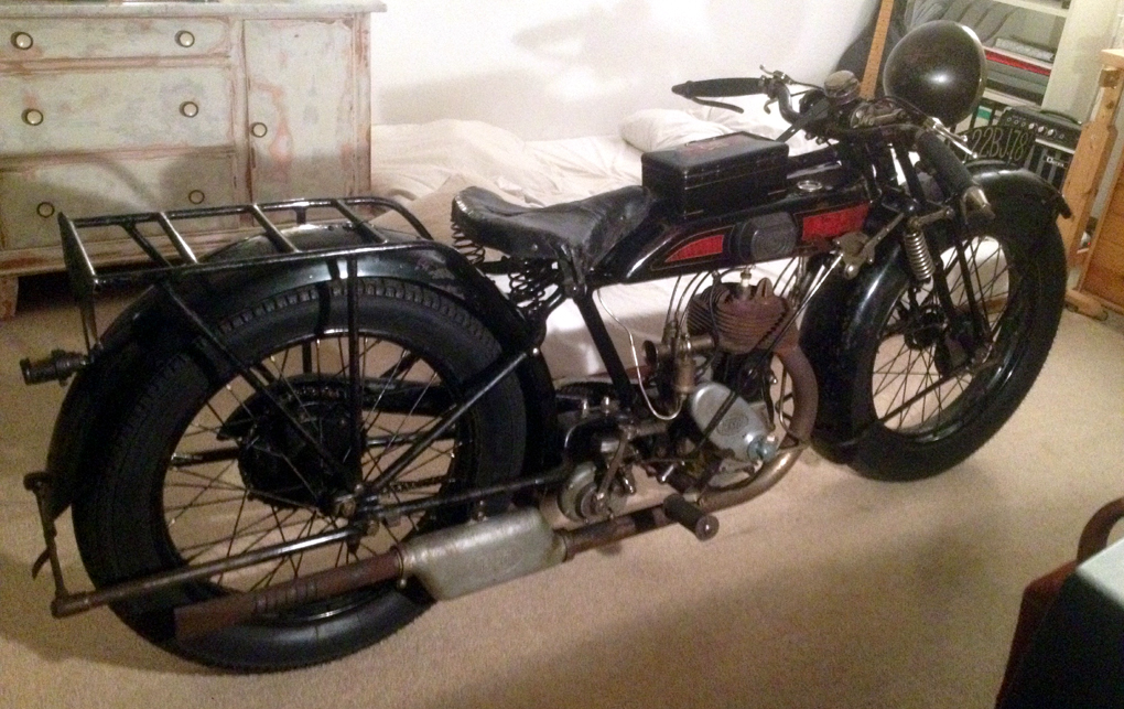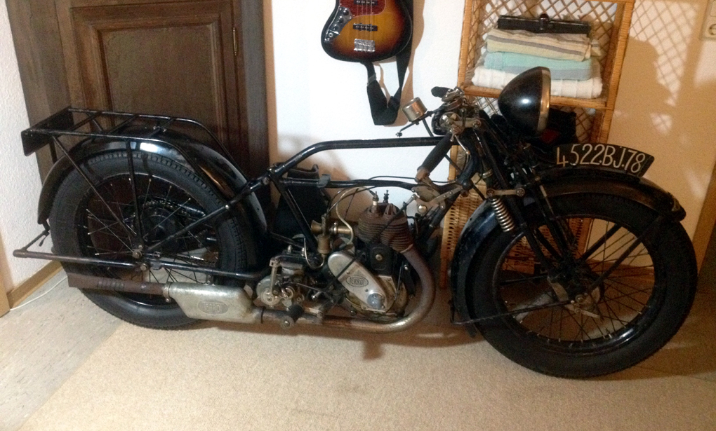 Tank + Öltank zur Aufarbeitung demontiert. Beifahrerfußrasten und Sozius nach langem Hadern ("DER ORIGINALZUSTAND! FREVEL!") abgeschraubt und eingelagert, ebenso das originale, beleuchtete französische "Nummernschild", an dessen Stelle irgendwann ein deutsches kommen soll. Die Linienführung gefällt mir jetzt besser, und mit ca. 9 PS sowie den zeitgemäßen Verzögerungseinrichtungen werde ich mich hüten, jemanden mitzunehmen.