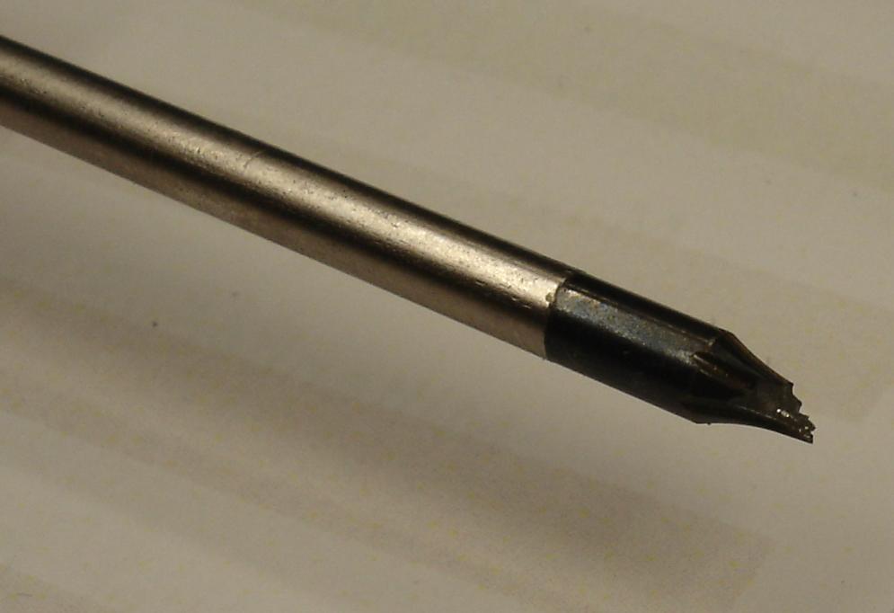 Erstmal eine Bohrlehre aus Automatenstahl gedreht. Für einmaligen Gebrauch reicht das ja. Aussendurchmesser 6,18mm. damit sie saugend in die Bohrung passt, Länge 25mm, mit einer 1,4mm Bohrung. Damit bohr ich mit dem Dremel den M4-Messingkern an um einen TX6er Torx rein zu klopfen. Im Bild die Bohrlehre mit 1,4er Bohrer.