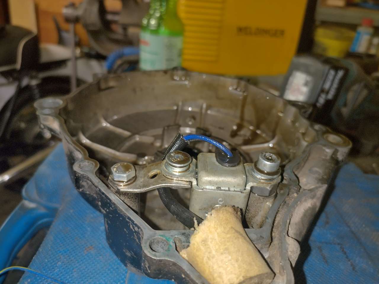 - Alles zusammengebaut, Sensor verkabelt, und mit der Bohrmaschine den Motor (ohne Kerze) durchgedreht, dabei die Zündlichtpistole ans Fenster gehalten. -> Zündung genau im auf dem Polrad markierten Fenster.
