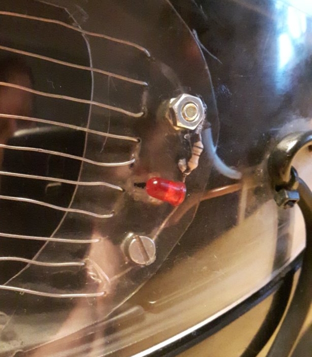 Das Stromkabel (Kupferlitze) hat zu Ösen geformte verzinnte Enden, die mit den zu Ösen gebogenen Widerstandsdrahts-Enden gemeinsam aufs Heizvisier geschraubt werden.