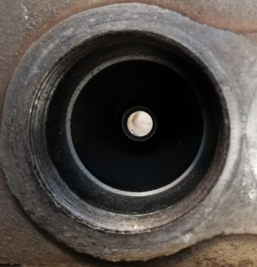 Ventilsitz Auslaßventil nach dem Einschleifen. Da sind seltsame "Flecken" zu sehen.