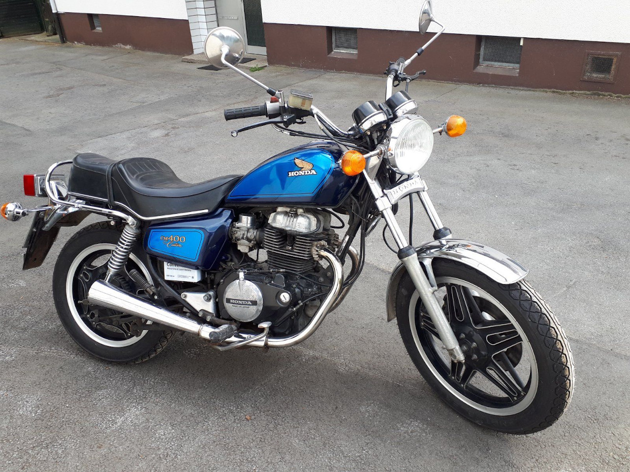 Na dann löse ich mal auf. Es ist im Original eine CM400T. Das ist die Chopper Variante der CB400N. Kurioserweise hat die keinen Kickstarter und einen Gang mehr. Es ist schon erstaunlich was ich so mit 17 unter Chopper verstanden habeAber seit dem sind einige Jahre ins Land gezogen und ich habe immer mal wieder was daran modifiziert. Mein Lieblingsstück ist die 2.WK Gasmaskendose als Luftfilterkasten mit originalem Filter, weil der böse Onkel vom TÜV mir einfach keine offenen Luftfilter eintragen wollte.