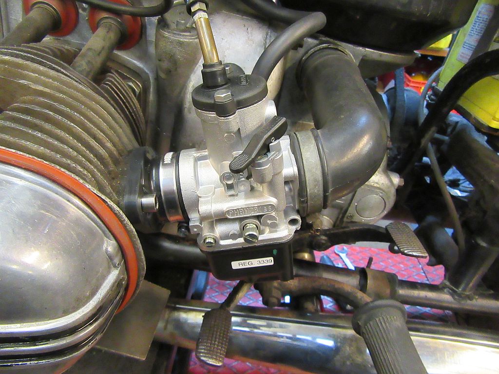 Die Kompressionsmessung ergab gleichmässig niedere Werte auf beiden Zylindern. Auf der Skala bei etwa 6,5:1. Die Ansaugstutzen sind definitiv beide am Ende. Weiss jemand, wo ich ein brauchbares Vergaserpärchen und zwei neue Ansaugstutzen herbekomme?