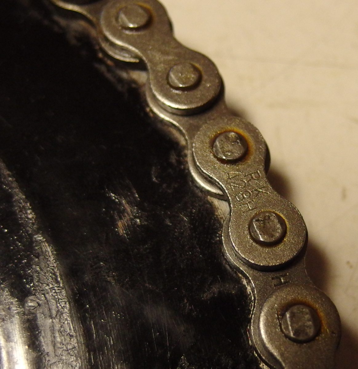 Die Probe mit aufgelegter, neuer 428er Kette zeigt - meiner Meinung nach - dass die Ritzel tatsächlich noch ganz in Ordnung sind.