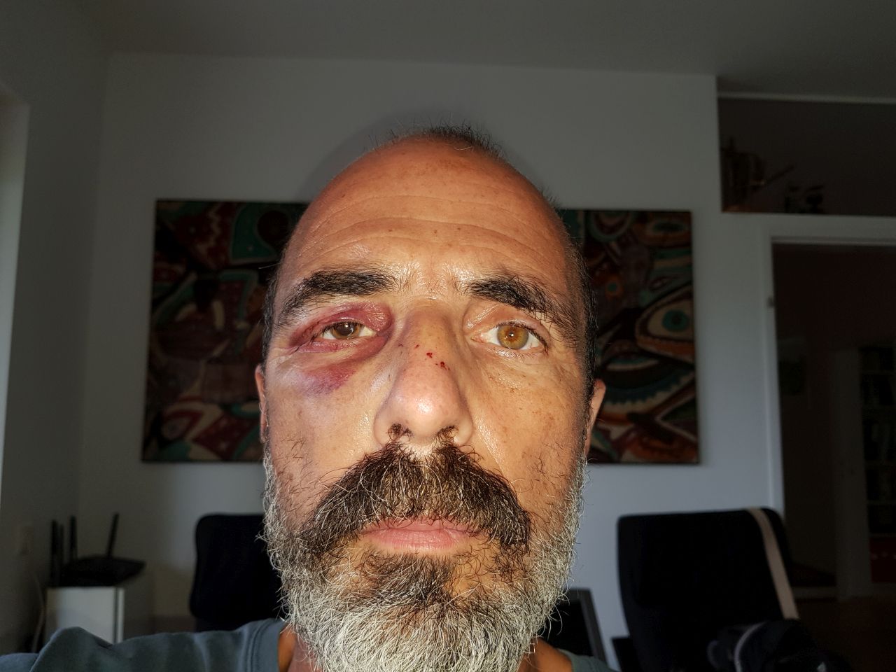 Nachdem ich in der Dunkelheit auf einen Bettpfosten gestürzt bin, ist das Nasenbein hinüber, die Hornhaut angekratzt, das Lid genäht, die Netzhaut ist aber zum Glück nicht abgelöst. Und 3 Ripperln sind auch durch, nachdem sie wohl schon vorgeschädigt waren.