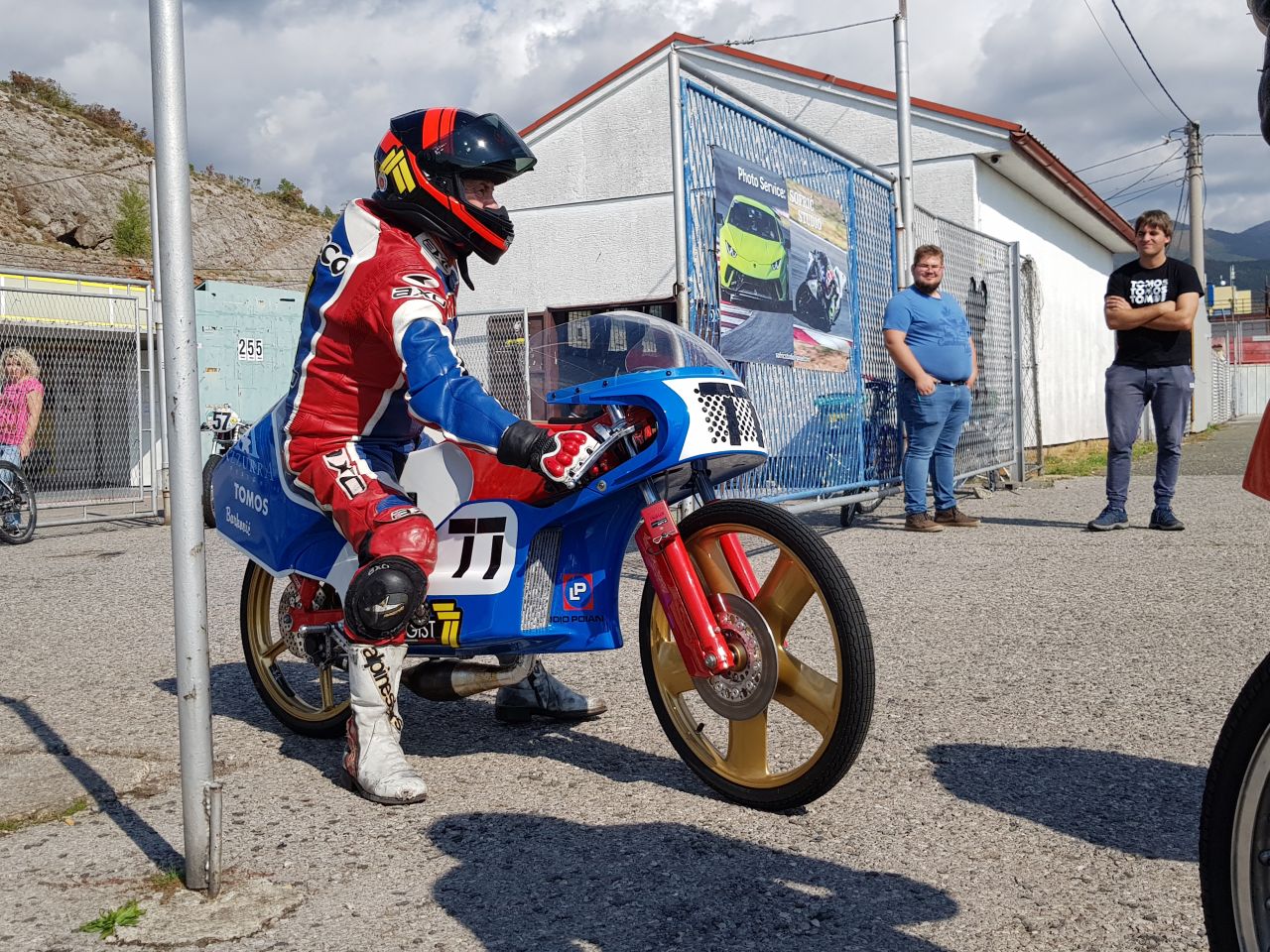 Ach ja, der Sturz: Wiedermal mein Fehler wie vor 2 Jahren: zuwenig Geduld. Damals wegen noch kalten Reifen gleich in der ersten Runde vorne weggerutscht, weil ich die 3 oder 4 Typen rücküberholen wollte, die mir beim Start entwischt sind, und ich genau wusste, dass ich etwas schneller bin. Und diesmal, weil ich so einen Stinker2takter vor der 200 Grad Zagrebkurve famos ausgebremst hatte, allerding in der Ungeduld gleich einen langsamen Zweiten innen auch schnupfen wollte in derselben Kurve. Schnell isses weggegangen, das Vorderradl, zum Glück keinen Anderen mitgerissen. Mir kaum was passiert, blauer Fleck am Unterarm, aber das neue Leder gehört zum Schuster