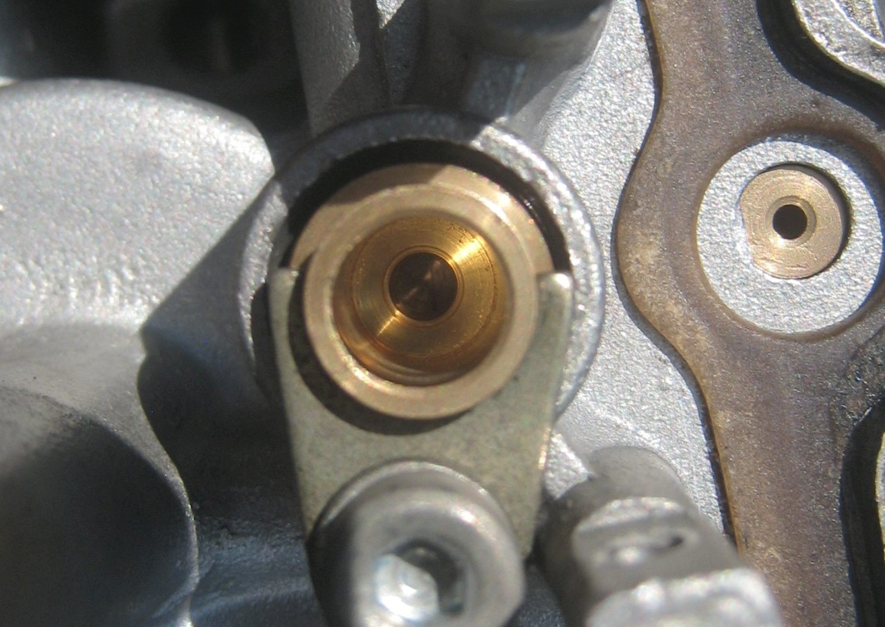 Die Zunge war ursprünglich ziemlich weit hochgebogen, ich habe sie wieder runtergebogen und dafür den ganzen Metallteil des Schwimmers entsprechend eingestellt. Vergaser mit der Oberseite nach unten gehalten, Schwimmernadel ganz drin, Schwimmer so eingestellt, dass die Naht am Schwimmer parallel zum Vergasergehäuse ist, und die Zunge am Schwimmer den federnden Stift gerade berührt.