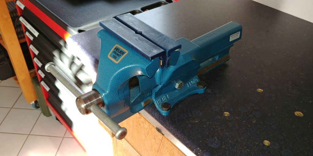 Die Werkbank wurde erst vor kurzem neu aufgebaut aus 50er Quadratrohr und einer 30er Multiplexplatte. Mein Schraubstock der Herzen