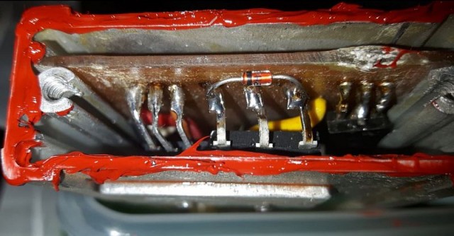 Gedichtet und die Platine fixiert wird mit Motorsilikon, und man sieht auch die nachträglich eingelötete 15V-Zenerdiode (Schutzdiode).