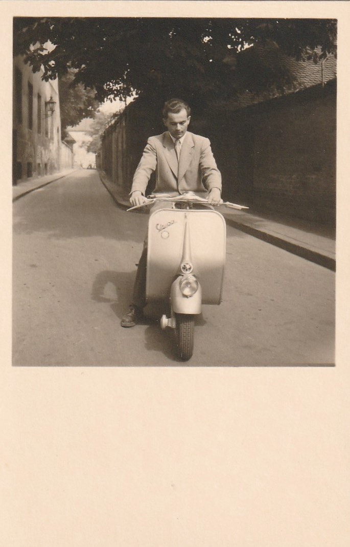 Das zweite mit dem gleichen Vehikel zeigt den Student auf den Weg in die TU München (damals noch Technische Hochschule), wo er bei Döllgast und anderen Architektur studierte. Und zwar, wie damals noch üblich, mit Krawatte und Anzug. Beide Fotos stammen aus 1948.