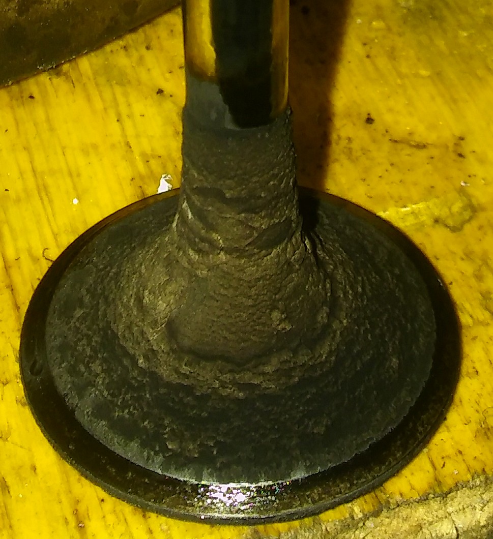 Einzig auffällig ist der Auslassventilsitz, der schmutzig ist, hier am Ventil fotografiert: