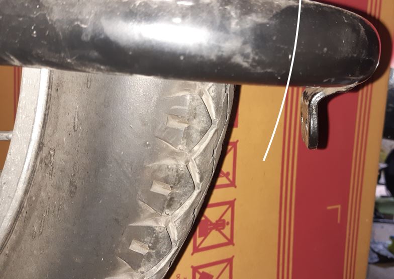 Der bisherige "Flat Fender" war an 4 Silentblocks montiert. Die sind wegen der schönen Wölbung des Neu-Kotis ungeeignet. Insbesondere am unteren Haltepunkt an der Schwinge, wo ein gerades Blechstück als Haltepunkt dient. Der Spalt zwischen Koti und Blech ist unten ca. 1,5 cm und oben ca. 0,5 cm an der engsten Stelle, uns seitlich wird das durch die Rundung des Kotis etwas mehr.