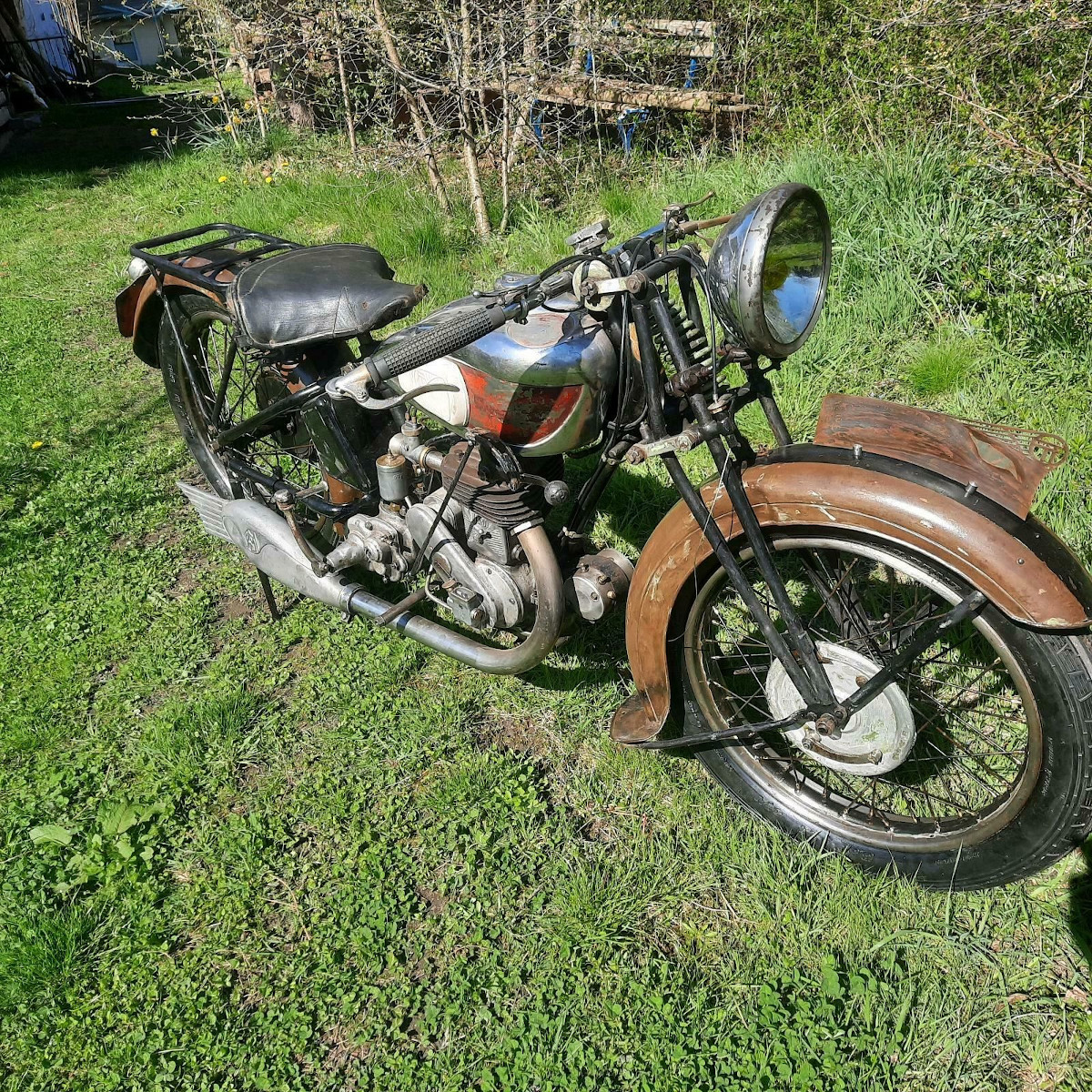 Ich habe vor ein paar Monaten eine alte Terrot 350 im schönen Sachsenland erworben. Laut Rahmennummer ist sie ein Modell HST von 1939. Allerdings mit Tank, Gabel, Schutzblech und Motor von einer HD Bj. 1936. Motor lief, musste noch ein bisschen hier und da… Zurück in der Werkstatt habe ich mich etwas in das ganze Geraffel vertieft und festgestellt, dass „fahrfähig“ doch irgendwie schöner sein könnte. Und wie so oft ist die ganze Schüssel jetzt bis auf die letzte Schraube zerlegt. Und ich habe eine Menge Bockmist gefunden!!