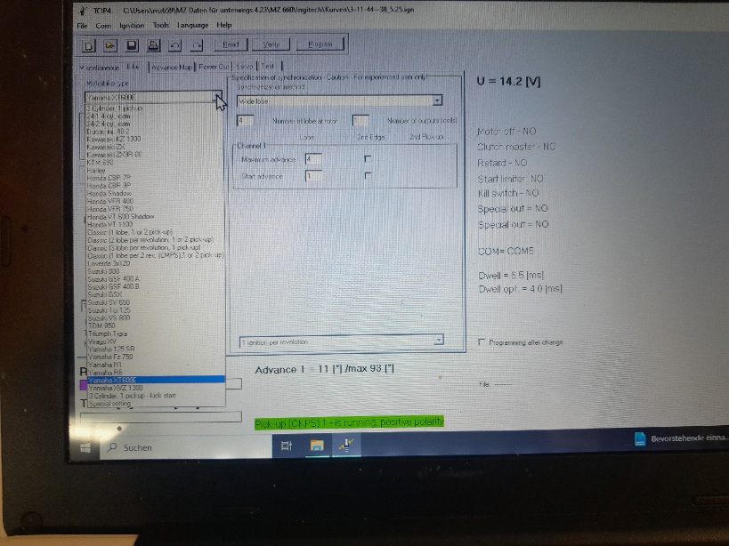 Nehme ich den Haken für "2nd Pickup" in obigem Bild heraus, startet der Motor garnicht mehr, die Zündung stellt sich praktisch tot ( wofür ist dieser Haken dann gut?), obwohl sie anzeigt, dass sie das Signal für den 1. Pickup bekommt (grün unterlegte Zeile unten beim Startversuch). Dabei ist es egal, ob der Sensor elektrisch angeschlossen ist oder nicht.