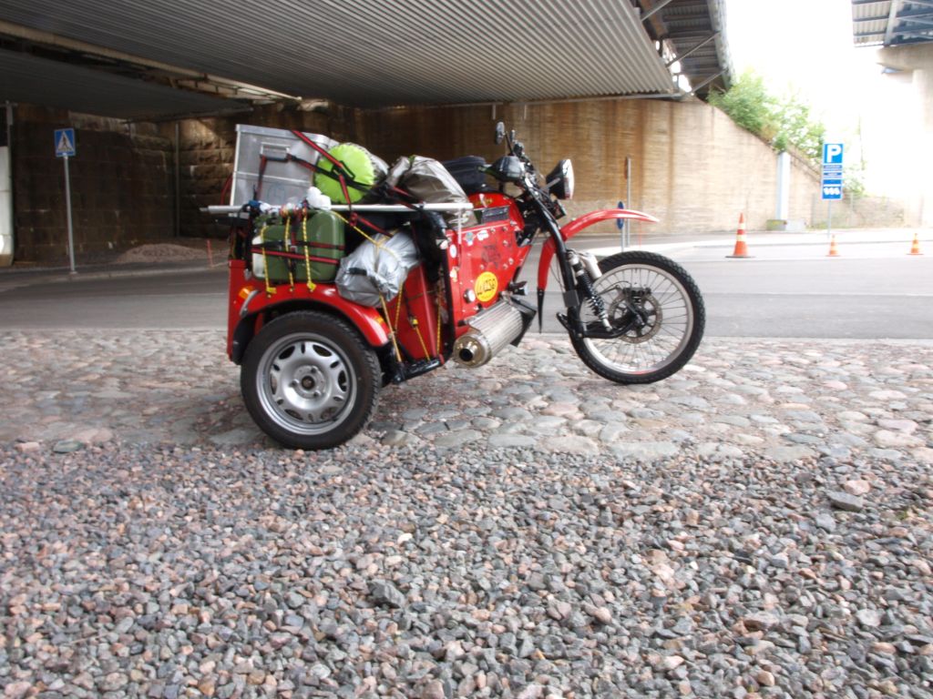 Als ich mit dem DR Gespann unterwegs war, war wegen der Tankform, ein Tankrucksack keine Option. Wohin also mit dem Kleinkram. Die Fahrradtasche ist ein prima Ersatz für einen Tankrucksack.