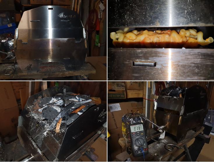 Ein weiterer Vorteil der Verwendung der Cap als Spießgrillhalter: man kann nicht nur mittig einen Drehspieß auflegen, sondern (bei schlankem Grillgut) auch rechts und links davon manuell flache Schaschlikspieße auflegen ... entweder direkt ohne Modifikation, oder man flext mit der Millimeterscheibe ein paar senkrechte Schlitze dafür in die Cap, dann können sie sich nicht verdrehen, wenn sie unwuchtig sind.