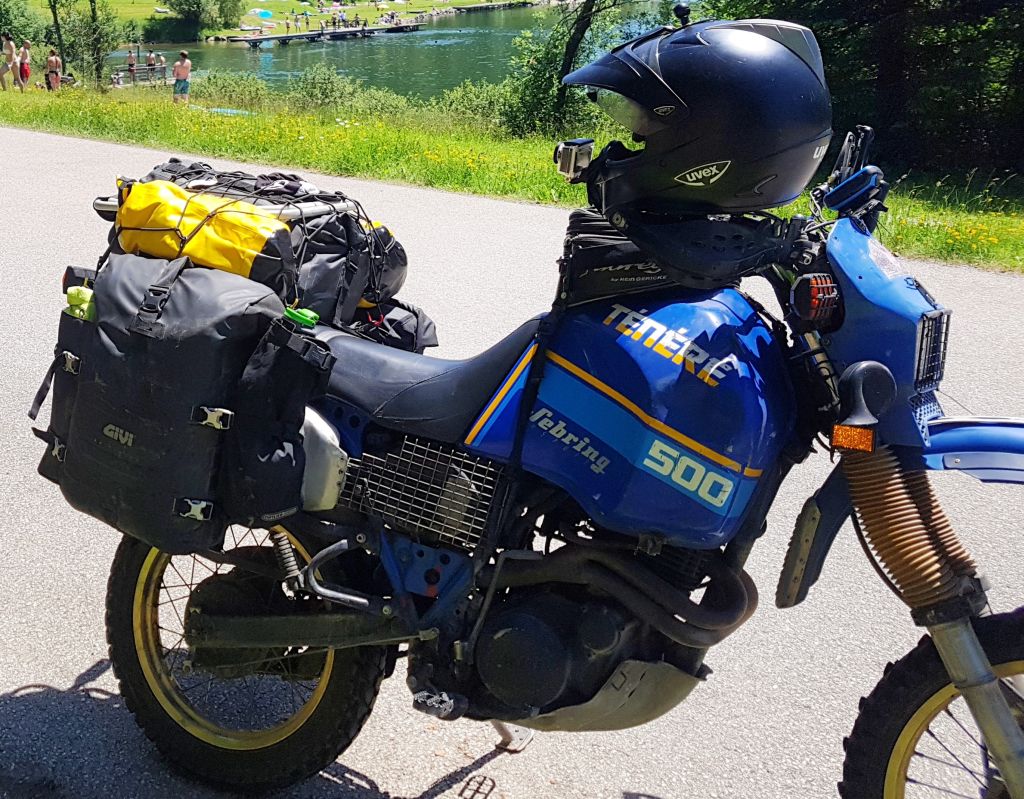 ZelttascheHab ich nur ausgepackt, wenn Zelten angesagt war. Sonst blieb die Tasche am Motorrad, die Crocs kriegt man seitlich raus.
