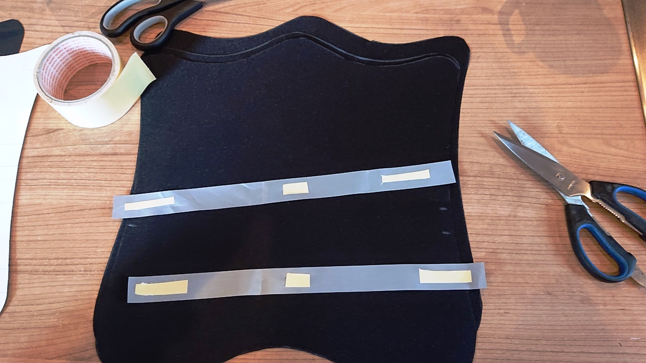 Die beiden verschieden dicken Platten wurden mit doppelseitigem Klebeband verklebt und wurden am Ende gemeinsam mit den Taschen verschraubt. Das Klebeband dient also nur der Fixierung während des Konstruktionsprozesses.