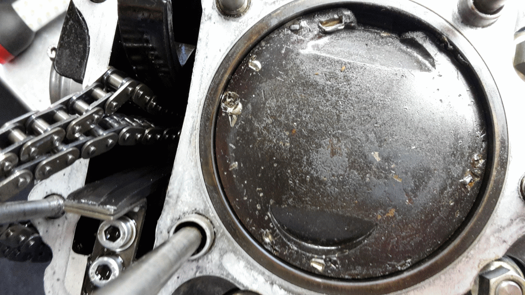 Noch zum Motorschaden ...bei der Zerlegung zeigte sich, am Kolben fehlt ein Stück. Teile davon sind in Kolben und Zylinderkopf eingeschlagen und im Endtopf fanden sich gebrochene Kolbenring Reste.