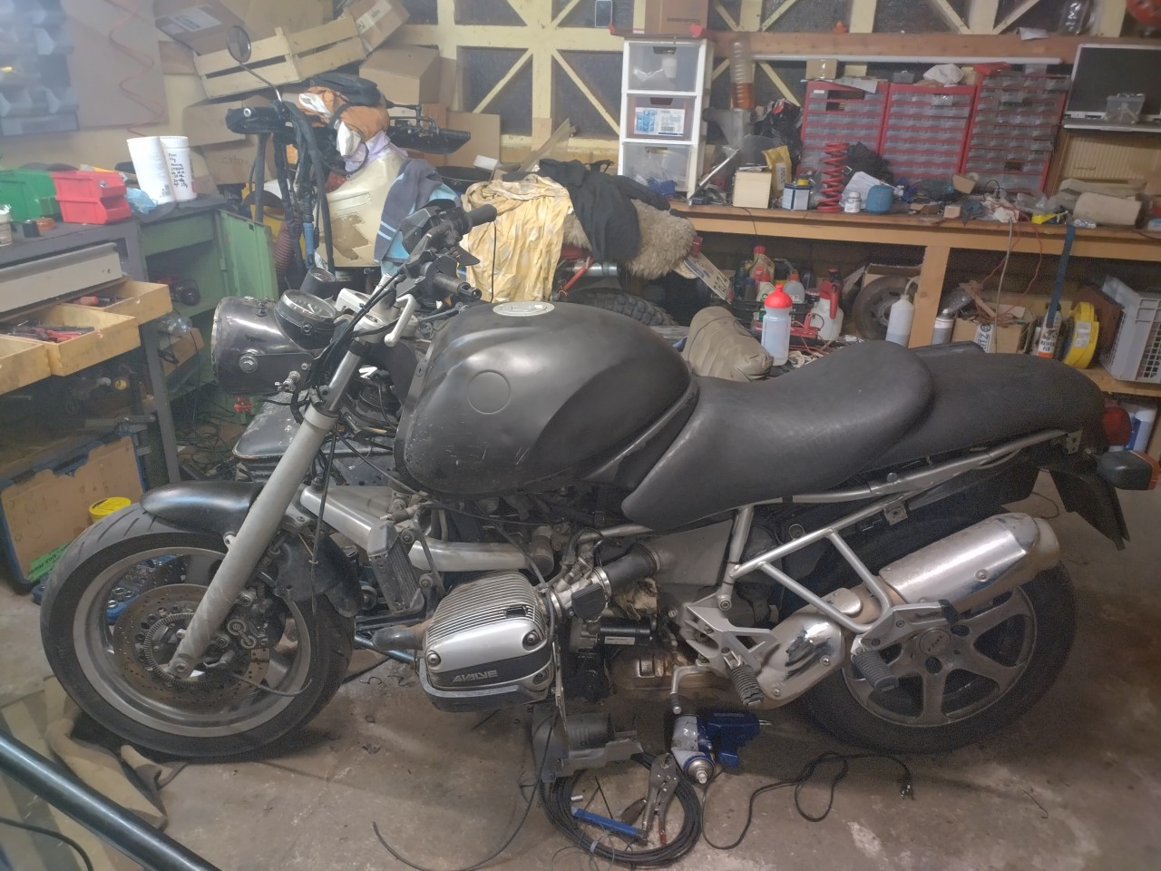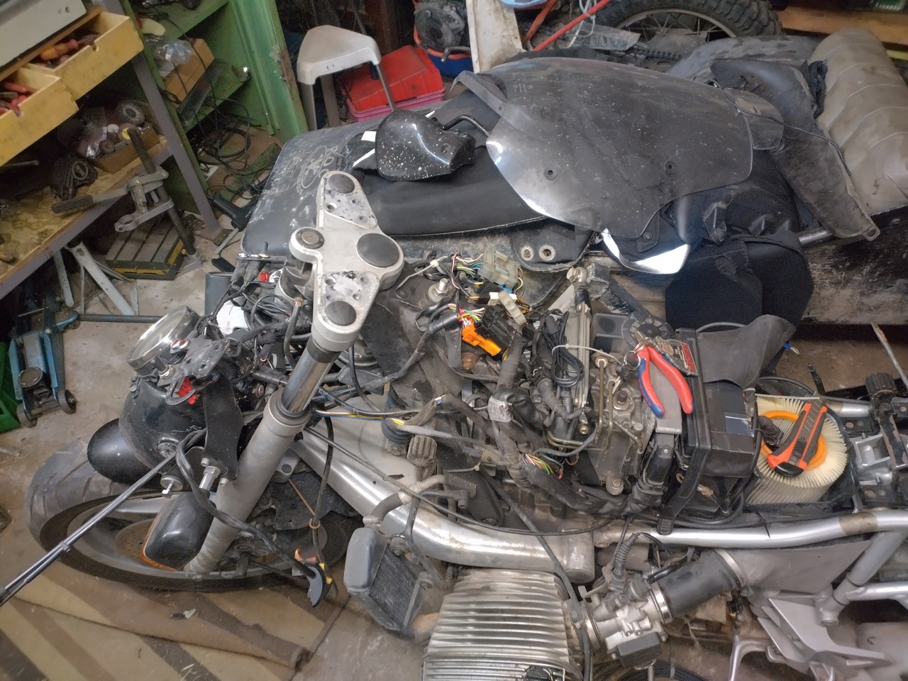 Den Lenkkopfanschlag an der neuen Gabelbrücke muss ich noch etwas abfräsen, die 1150R hat weniger Lenkeinschlag als die 1100R. Mit dem GS-Lenker egal, es gibt genug Platz, also weg damit.
