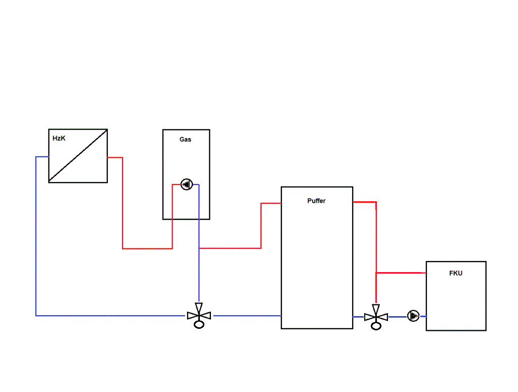 Das würde bedeuten, das du einen Kreislauf bildest mit dem Kessel und Pufferspeicher und einen Kreislauf zu den Heizkörpern.