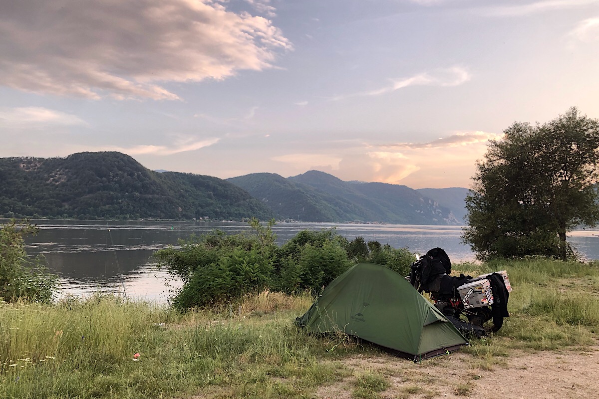 Nach Temeswar bin ich südlich Richtung Reschitza gefahren in einen Nationalpark. Auf dem Berg wollte ich dann eine kleine Abkürzung durch den Wald nehmen, jedoch musste ich nach 12km umdrehen, da die Straßen teilweise 40cm unter Wasser standen alles voll mit Matsch und Schlamm war. Die Spurrillen wurden irgendwann so tief, dass ich nicht mehr mit meinen Koffern druchgepasst hätte. Nach zwei kleinen Stürzen habe ich dann umgedreht aber es trotzdem nen heiden Spaß gemacht, auch wenn es der Kette nicht sonderlich gut getan hat :grin: Abends kam ich in Baile Herculane an (ein Urlaubsgebiet für Einheimische) und wollte irgendwo mein Zelt aufschlagen. Nach mich aber zwei ziemlich aggressive Straßenhunde fast vom Motorrad geholt und angegriffen haben, bin ich doch auf einen kleinen Campingpaltz gefahren für 2€ die Nacht. Camping ist in Rumänien eine Art Nationalsport und es wird einfach überall gezeltet oder im Auto auf der Rücksitzbank eines Kleinwagen geschlafen. Am Tag danach habe ich an der Donau gezeltet und eine Gruppe Rumänen kennen gelernt, die über das Wochenende an der Donau fischen waren. Obwohl nur einer bisschen Englisch gesprochen hat wurde ich super aufgenommenund mit reichlich Bier und Essen versorgt.