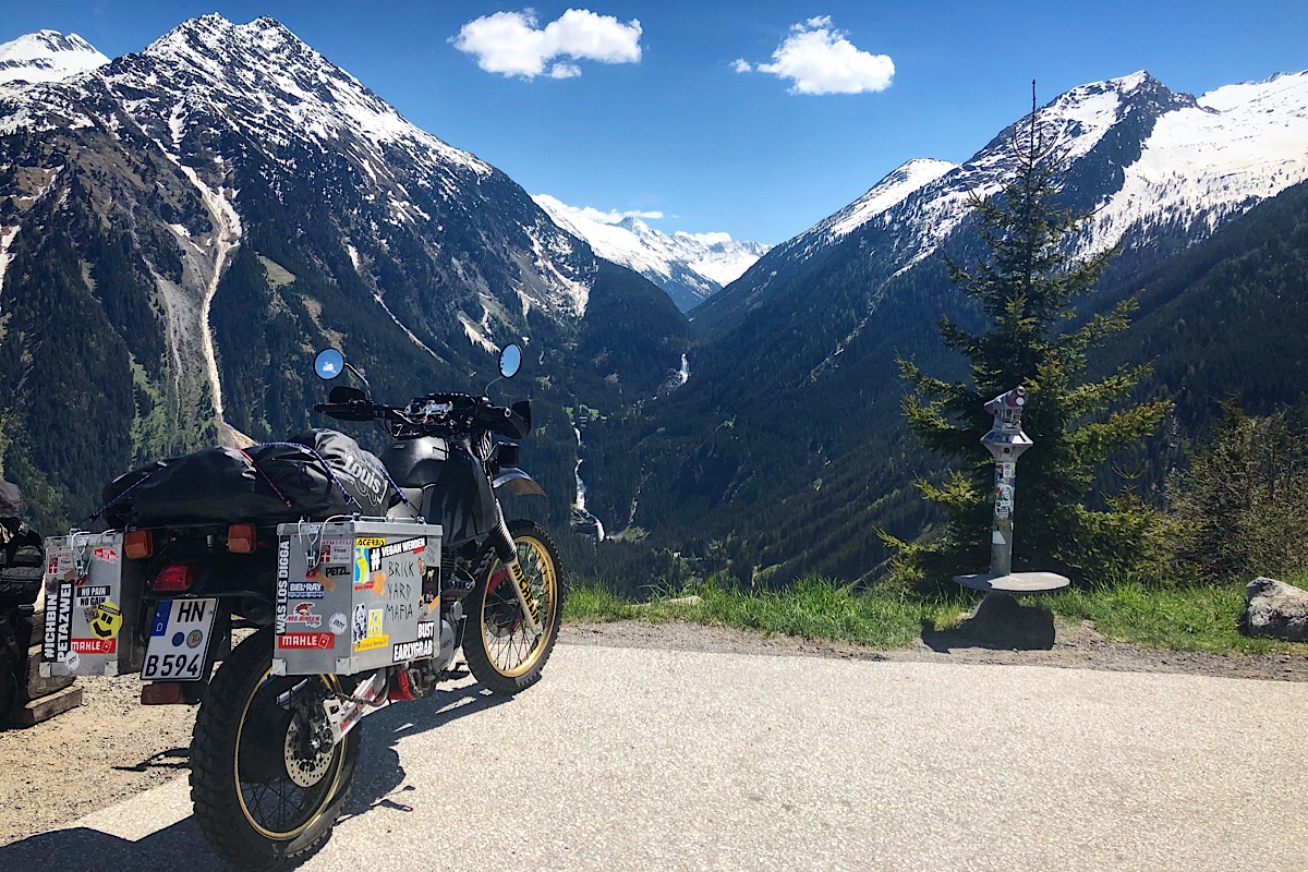 Ich bin am 31.5 bei mir zu Hause in der Nähe von Stuttgart losgefahren und kam Abends mit einem Zwischenstop in Aalen in Altstätten in der Schweiz an. Ich muss dazu sagen, dass das die erste größere Strecke war, die ich mit der XT incl Gepäck gefahren bin und ich mich nicht sonderlich wohl gefühlt habe. Nach ein paar Tagen habe ich aber daran gewöhnt und ich konnte die Fahrt genießen. Aber schon am ersten Tag fielen mir ein paar Schwachstellen auf; der Zylinderkopf hat geölt, der Öltank hat zwei Tage später zu ölen begonnen und die Gabel war viel zu weich. Leider waren zu dieser Zeit der Silverettapass und die Passstraße über Damüls gesperrt und ich konnte nur den Arlbergpass fahren und den Gerlospass fahren. Vor allem der Gerlospass war echt schön! Am Dritten Tag war ich bei Bekannten in Zell am See untergebracht und habe mich erstmal um den Öltank und den Kopf gekümmert. Am Kopf hat sich die Schraube oberhalb des Drehzahlmessers im Zylinderkopf gelöst und Öl gespeit.