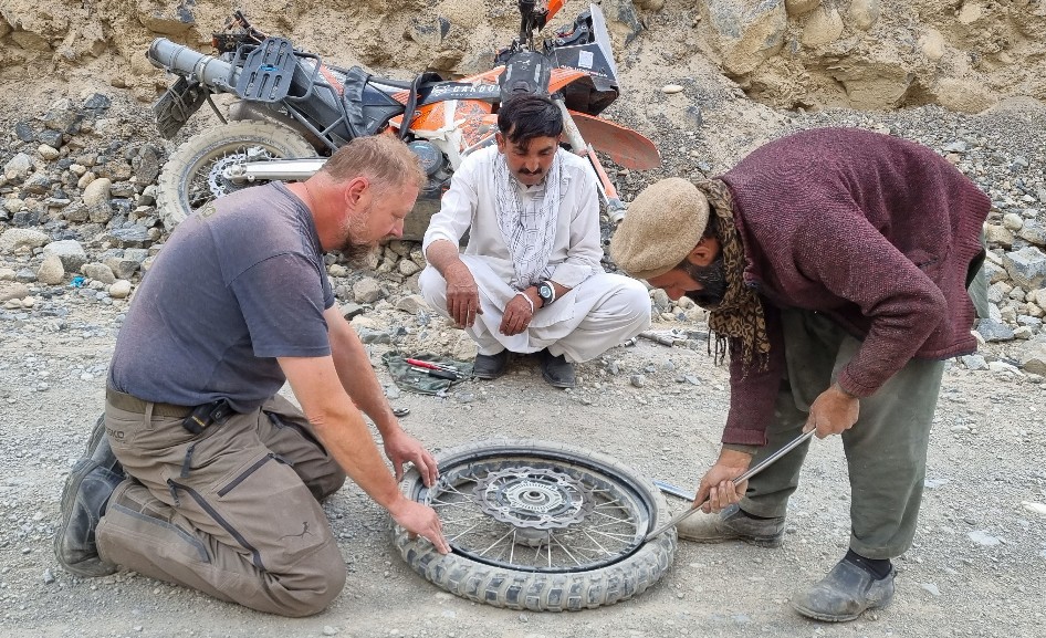 Früh am Morgen, als alle noch schlafen, steht der Schlagbaum, der die Zufahrt zur Fairy Meadows Road und zum Nanga Parbat sperrt, offen. Schon auf den ersten Metern stellen wir fest, warum die Fairy Meadows Road als eine der gefährlichsten Straßen der Welt gelistet ist. Im unteren Bereich machen große Steine das Fahren schwer, weiter oben ist es eher die Psyche. Man muss schon eine Ladung Vertrauen in sein Fahrzeug und auch etwas Fahrkönnen mitbringen, um im losen Geröll entlang der senkrechten Felswände entspannt zu fahren. Nach nur zwei Kilometer fahre ich mir an einem der spitzen Steine den Vorderreifen platt. Um leichter zu reisen habe ich natürlich sämtliches Werkzeug in der Unterkunft im Tal gelassen. Die nächsten zehn Kilometer fahre ich ohne Luft weiter.