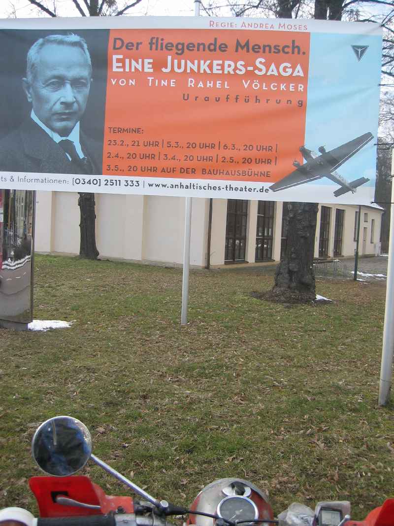 Hinter Leipzig und kurz vor Dessau wurde es wieder schwarz und ein Schneesturm brach herein. Die wild tanzenden Flocken brachten Hell ins Dunkel. Trotzdem konnte ich nicht mehr viel erkennen. Bald hörte dies auf und wir verließen die Autobahn und fuhren nach Dessau hinein. Ein Aufwärmen in der BAUHAUS-Kantine stand auf dem Plan. Wir überquerten die Mulde und die Elbe und bald erreichten wir unser Ziel, um halb vier nach 540 Kilometern.